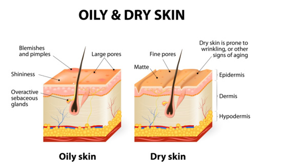 健康的皮膚障壁-酸性保護膜是一層薄的天然脂質,可防止水分經皮膚散失,這些物質有保濕效果,讓皮膚保持柔軟有彈性,維持著水份的平衡;所以膚質的分類標準完全取決皮脂腺的分泌量與皮膚含水量兩者間的平衡關係;乾性膚質的人,肌膚的油脂分泌量、含水量及保水能力都不足,此膚質易色素沉澱,長斑點;相反的油性肌膚皮脂腺分泌出來的皮脂膜偏多,易長痘痘不易長斑,但水量不見得會足夠,常出現外油內乾等情況;中性膚質就是最理想的狀態,油水達到最平衡的狀態,最不易有肌膚問題;另一種則是大多數人會有的混和性肌膚,T字部位偏油而兩頰偏乾,這種膚質需細心呵護慎選保養品,以免過度保養造成痘痘肌膚或形成敏感性肌膚。