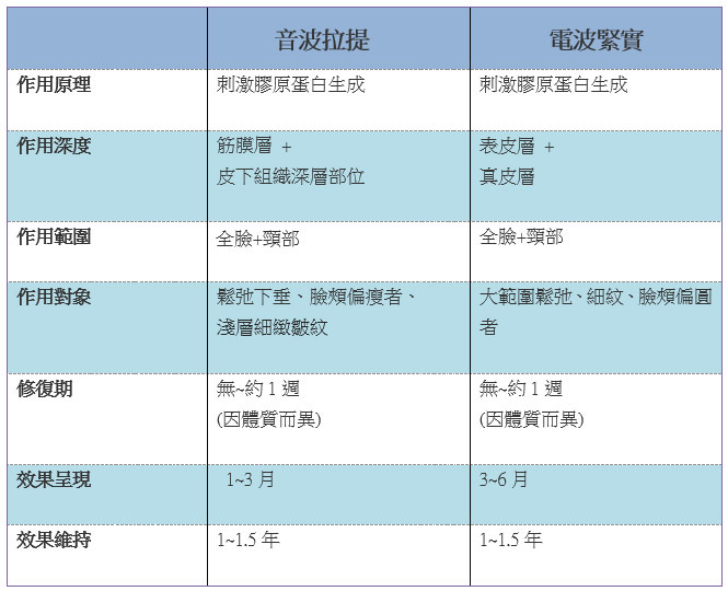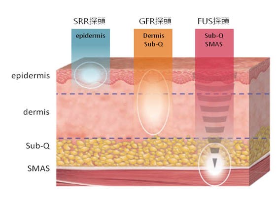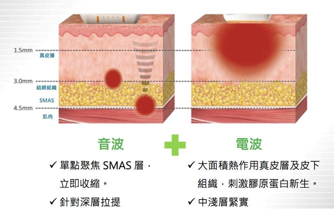 「音波」主要將能量聚集在筋膜層及皮下組織較深層的部位,使其收縮達到拉提的效果。